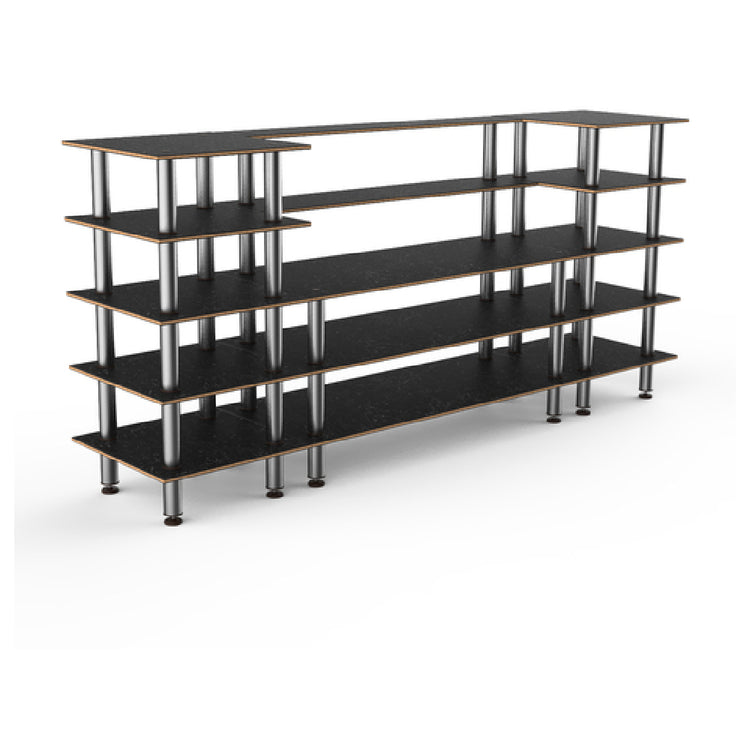 The Steelite MGCMLB04MSXF Mogogo Buffet Solutions Modular Bread & Pastries Station is a sophisticated and functional addition to any food service operation. This 5-tier station, measuring 130 inches in length, 29-1/2 inches in width, and 60-1/2 inches in height, provides ample space for displaying a variety of bread and pastries. Its rectangular design is enhanced by the luxurious appearance of Nero Marquina marble BHP high pressure laminate, which is supported by a sturdy bamboo core top. The brushed stainless steel legs add durability and a modern aesthetic, ensuring the station can withstand the demands of high-traffic environments. Designed for easy assembly and disassembly, this knockdown unit is convenient for transportation and storage. The Steelite MGCMLB04MSXF Mogogo Buffet Solutions Modular Bread & Pastries Station is uniquely positioned to cater to upscale catering events, hotel buffets, and restaurant self-service areas, offering a blend of elegance and practicality. Its innovative modular design allows for customizable configurations, making it a versatile solution for various industry needs. Packed by 1 each, this station is a testament to Steelite International’s commitment to quality and design excellence in the food service sector.