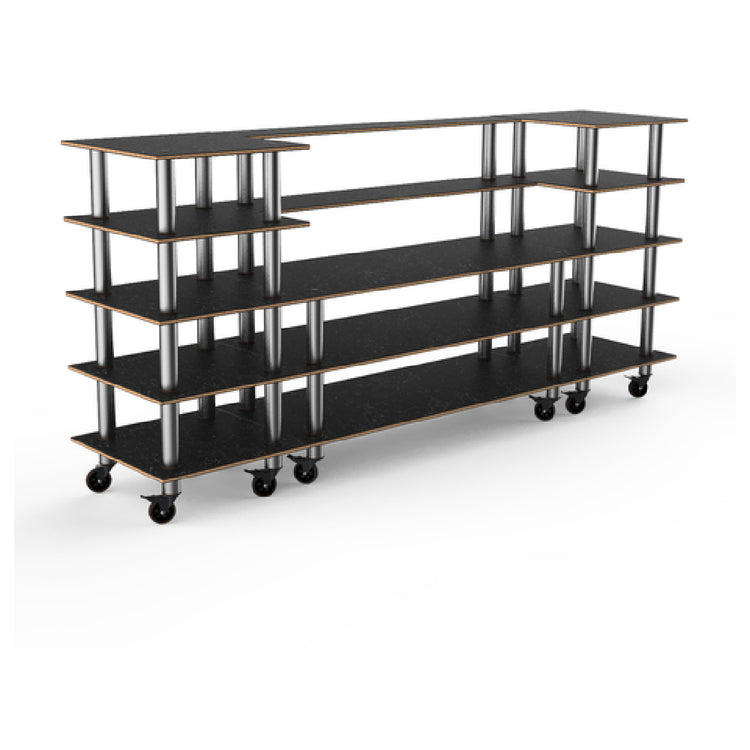 The Steelite MGCMLB04MSXW Mogogo Buffet Solutions Modular Bread & Pastries Station is a flexible five-tier solution designed for commercial buffet settings. Measuring 130 inches by 29-1/2 inches and standing 60-1/2 inches high, this rectangular station accommodates a variety of bread and pastry arrangements. Its surface is crafted from Nero Marquina marble BHP high-pressure laminate with a bamboo core top, combining elegance with durability. The station is equipped with brushed stainless steel casters, enhancing its mobility across different event spaces or dining areas. Additionally, the station features a knockdown design, allowing for convenient assembly and disassembly, which is particularly beneficial for catering services and venues with limited storage space. This product is packed as a single unit, ensuring easy handling and setup. The Steelite MGCMLB04MSXW Mogogo Buffet Solutions Modular Bread & Pastries Station is ideal for hotels, banquet halls, and conference centers seeking a sophisticated and practical buffet display solution.