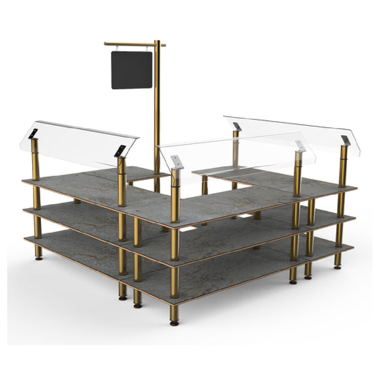 The Steelite MGCMLB06GBXF Mogogo Buffet Solutions Modular Salad Station is a versatile and expansive 3-tier unit, measuring 100-1/2" by 100-1/2" by 94"H, designed for high-capacity, self-service environments. Its rectangular configuration features three breath guards, ensuring food safety and hygiene. The unit is enhanced with a sign post and chalkboard, providing a customizable element for labeling and information display. The surface is constructed from grey slate BHP high-pressure laminate with a durable bamboo core top, offering both aesthetic appeal and resilience. Supported by brushed brass legs, the structure is as elegant as it is sturdy. The knockdown design allows for efficient storage and easy assembly, making it highly adaptable for various settings. This salad station is particularly suitable for hotels, catering services, and large-scale events where a premium, self-serve dining experience is required. With its combination of practical features and stylish design, the Steelite MGCMLB06GBXF Mogogo Buffet Solutions Modular Salad Station stands out in the industry for its ability to enhance buffet presentation and operational efficiency.