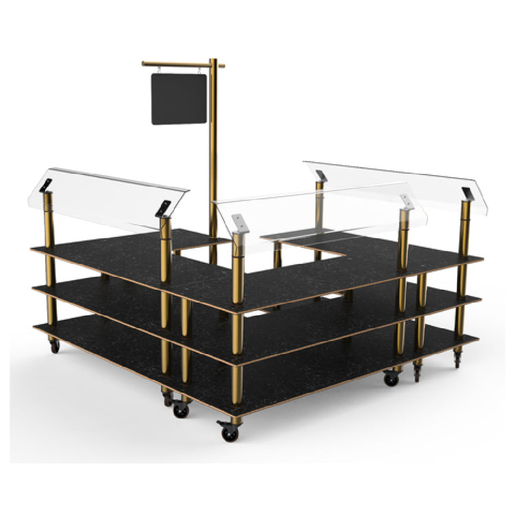The Steelite MGCMLB06MBXW Mogogo Buffet Solutions Modular Salad Station is a versatile 3-tier unit designed for high-end buffet presentations, measuring an impressive 100-1/2" x 100-1/2" x 94"H. This rectangular, self-serve station is crafted with a Nero Marquina marble high-pressure laminate and bamboo core top, offering both aesthetic appeal and durability. The salad station is equipped with three breath guards, enhancing hygiene by protecting the food from contaminants while maintaining accessibility for guests. Its design includes a signpost and chalkboard, allowing for customizable labeling and communication, which is essential for dynamic presentations in hospitality settings. The brushed brass casters provide mobility, ensuring the station can be easily repositioned as needed, while maintaining a sophisticated appearance. The knockdown design enables efficient storage and transport, making it ideal for event planners and catering services seeking flexibility and convenience. This modular salad station's construction and features cater to various industry segments, including hotels, resorts, and banquet facilities, where high-volume service and elegant presentation are crucial. With its combination of functionality and style, the Steelite MGCMLB06MBXW enhances the dining experience, aligning with the needs of both operators and guests.