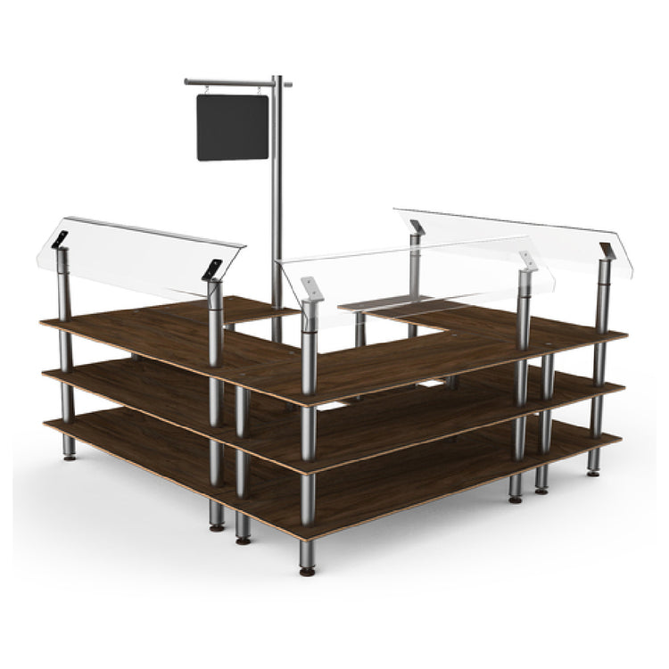 The Steelite MGCMLB06WSXF Mogogo Buffet Solutions Modular Salad Station is an innovative 3-tier unit measuring 100-1/2 inches by 100-1/2 inches by 94 inches in height, offering a versatile and self-serve solution for various dining environments. This rectangular salad station includes three breath guards, enhancing hygiene and maintaining the freshness of displayed items. The unit is designed with a sign post and a chalkboard, providing customizable options for signage and easy identification of food offerings. Constructed with Bengali mango wood BHP high-pressure laminate featuring a bamboo core top, it combines durability with a stylish aesthetic. The brushed stainless steel legs contribute to its modern appearance and sturdy structure. Packed as one unit, the Steelite MGCMLB06WSXF is ideal for catering services, buffets, and large dining venues seeking a flexible and aesthetically pleasing display solution that adapts to diverse culinary presentations. Its modular design allows for efficient space utilization, making it a valuable asset for businesses looking to elevate their food service experience through innovative buffet solutions.
