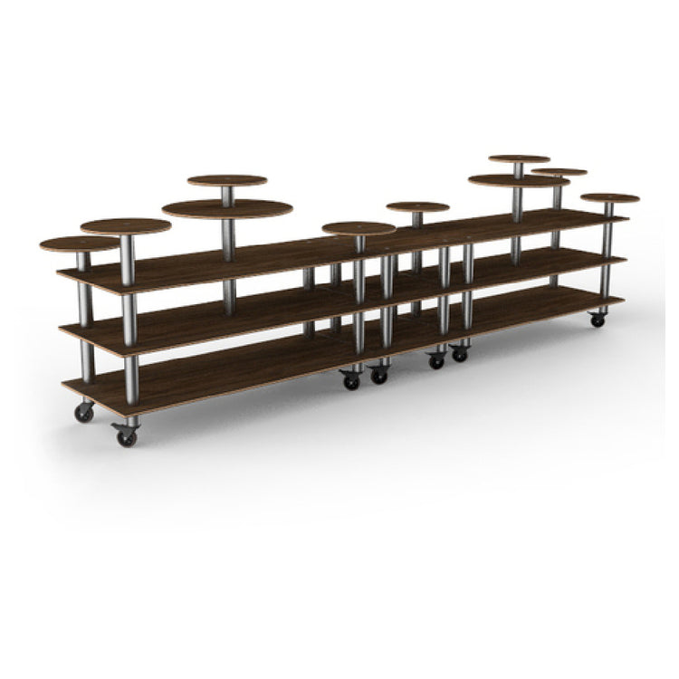 The Steelite MGCMLB08WSXW Mogogo Buffet Solutions Modular Display Station is a versatile piece of equipment designed for dynamic display needs. Measuring 180-1/2" x 38" x 54"H, this 3-tier station provides ample space for showcasing culinary creations across its ten multi-height shelves. Crafted with a high-pressure laminate top made of Bengali mango wood and featuring a bamboo core, this display station offers an appealing aesthetic while ensuring durability and ease of maintenance. The rectangular design is complemented by brushed stainless steel casters, enhancing mobility to adapt to various event settings. Delivered in a knockdown format, this station is convenient for transport and assembly, making it ideal for caterers, hotels, and banquet halls. The Steelite MGCMLB08WSXW strikes a balance between form and function, providing a sophisticated solution for any professional catering or hospitality environment seeking to maximize display efficiency and visual impact.