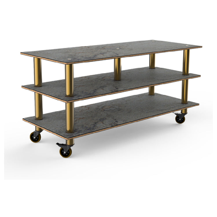 The Steelite MGCMLB09GBXW Mogogo Buffet Solutions Modular Midhole Display Unit 3-tier is a sophisticated and functional display unit designed to cater to diverse market segments within the hospitality industry. This unit measures 71 inches in length, 29-1/2 inches in width, and stands at a height of 35 inches, making it a substantial presence in any buffet or event setting. Its rectangular design is both modern and versatile, suitable for a wide range of culinary presentations. The display features a grey slate BHP high-pressure laminate top with a bamboo core, offering a durable and aesthetically pleasing surface that can withstand the demands of high-traffic environments. The inclusion of brushed brass casters ensures easy mobility, allowing for effortless repositioning and storage when not in use. This knockdown unit is packed by each, emphasizing convenience in transportation and assembly. The Steelite MGCMLB09GBXW Mogogo Buffet Solutions Modular Midhole Display Unit 3-tier is an ideal choice for hotels, catering services, and banquet halls looking to enhance their presentation capabilities with a stylish and practical solution. Its modular design allows for customizable configurations, making it adaptable to various event themes and requirements, thereby providing exceptional value to professionals in the food service industry.