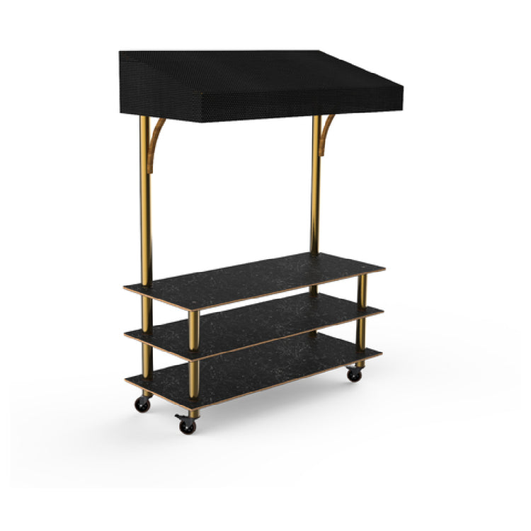The Steelite MGCMLB10MBBW Mogogo Buffet Solutions Modular Classic Canopy Unit 3-tier is a versatile and elegant display solution for diverse hospitality environments. With dimensions of 71" x 29-1/2" x 96"H, this rectangular unit is crafted from high-quality Bengali mango wood BHP high-pressure laminate, featuring a bamboo core top for enhanced durability and aesthetic appeal. The unit is topped with a sleek black canopy and complemented by brushed brass casters, ensuring both stability and mobility for dynamic buffet presentations. The knockdown design of the unit allows for convenient assembly and disassembly, making it well-suited for event venues and catering services that require flexibility in their layout arrangements. Each unit is packed individually, emphasizing its premium quality and attention to detail. This product is tailored to meet the needs of the hospitality industry, providing a stylish and functional centerpiece for buffet displays, enhancing the guest experience while optimizing space efficiency. Its modular design allows for customization, adapting to various buffet themes and settings, thereby appealing to hotels, resorts, and other foodservice establishments seeking a sophisticated and practical buffet setup. The Steelite MGCMLB10MBBW unit is a testament to refined craftsmanship and innovative design, making it a valuable asset in any professional setting.