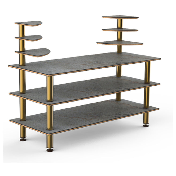 The Steelite MGCMLB11GBXF Mogogo Buffet Solutions Modular Classic Multi-Shelf Station is a versatile and elegant choice for sophisticated dining settings. This 3-tier station boasts a substantial size of 71 inches in length, 29-1/2 inches in width, and stands 54 inches tall. Its rectangular framework is thoughtfully designed with six triangular shelves, allowing for a creative and efficient display of culinary delights. The grey slate BHP high-pressure laminate top, featuring a durable bamboo core, adds a unique aesthetic appeal while ensuring longevity and resilience. Supported by sleek brushed brass legs, this station embodies a blend of modernity and class. The knockdown design facilitates easy assembly and disassembly, making it suitable for high-demand environments such as banquets, hotels, and upscale restaurants. Each unit is meticulously packed to ensure safe delivery, emphasizing Steelite International's commitment to quality and customer satisfaction. The modular nature of this station provides a unique value proposition for businesses seeking customizable and adaptable buffet solutions, catering to the diverse needs and preferences within the food service industry. Its combination of style, practicality, and premium materials makes the Steelite MGCMLB11GBXF an indispensable asset for any professional catering or hospitality operation.