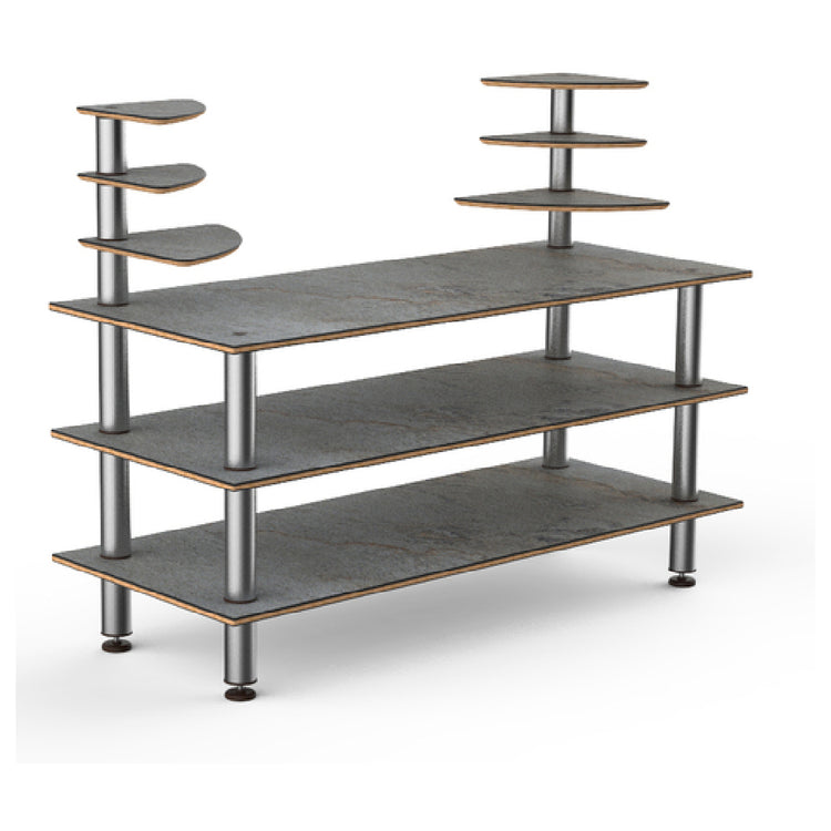 The Steelite MGCMLB11GSXF Mogogo Buffet Solutions Modular Classic Multi-Shelf Station is a versatile, high-quality unit designed for dynamic buffet setups. This product stands out with its 3-tier design, providing substantial space for display and organization. Measuring 71 inches in length, 29-1/2 inches in width, and 54 inches in height, its rectangular form accommodates various culinary arrangements. The unit includes six innovative triangular shelves, which offer unique display options and enhanced accessibility. Constructed with grey slate BHP high-pressure laminate, it features a durable bamboo core top, combining elegance with resilience. The brushed stainless steel legs not only contribute to its robust structure but also add a sleek, modern aesthetic. This modular station is designed to be knockdown, allowing for easy assembly and disassembly, which is ideal for catering events or dynamic restaurant environments where flexibility is key. Each station is meticulously packed by one, ensuring quality and care in delivery. Perfect for hotels, catering companies, and upscale dining establishments, the Steelite MGCMLB11GSXF Mogogo Buffet Solutions Modular Classic Multi-Shelf Station combines functionality with a sophisticated design, catering to the needs of various market segments within the hospitality industry.