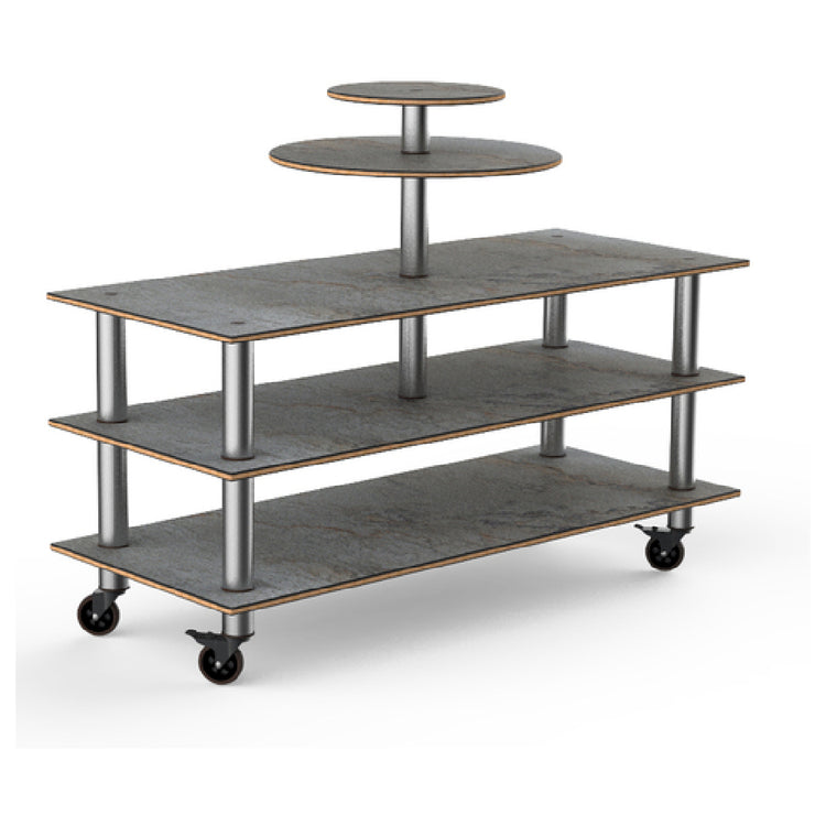 The Steelite MGCMLB12GSXW Mogogo Buffet Solutions Modular Multi-Purpose Display 3-tier is an innovative and versatile display solution crafted for a variety of professional environments. Measuring 75 inches by 29-1/2 inches by 53-1/2 inches in height, this rectangular unit combines practicality with aesthetic appeal through its grey slate BHP high pressure laminate surface with a durable bamboo core top. The design features two unique oval corner shelves, providing additional display space to cater to diverse presentation needs. Engineered with brushed stainless steel casters, the display ensures smooth mobility and flexibility in dynamic settings, while its knockdown construction allows for easy assembly and disassembly. This product is meticulously packed in a single unit, ensuring safe and straightforward transport. The Steelite MGCMLB12GSXW Mogogo Buffet Solutions Modular Multi-Purpose Display is a highly functional piece, ideal for enhancing the visual impact of any buffet setup. Its robust design and superior materials make it a standout choice for caterers, event planners, and hospitality professionals seeking both elegance and efficiency in their display solutions.