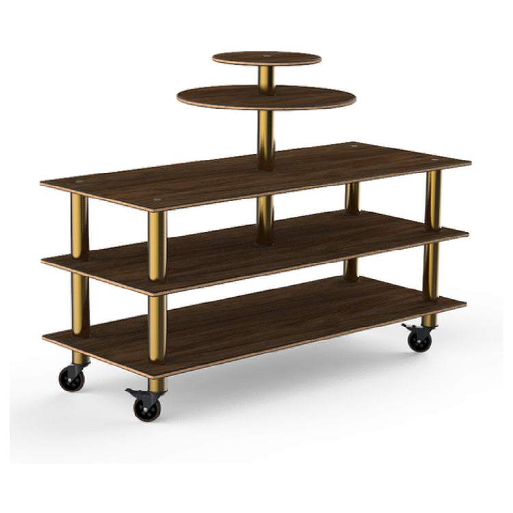 The Steelite MGCMLB12WBXW Mogogo Buffet Solutions Modular Multi-Purpose Display 3-tier is a versatile and elegantly designed unit for professional catering environments. With dimensions of 75 inches by 29-1/2 inches by 53-1/2 inches in height, this display offers ample space for showcasing a variety of culinary presentations. The structure features two round shelves, alongside a rectangular main tier, enhancing its capacity to accommodate diverse display needs. The Bengali mango wood with BHP high-pressure laminate and bamboo core top combines durability with aesthetics, making it both functional and visually appealing. Equipped with brushed brass casters, the display ensures ease of mobility, facilitating seamless integration into any buffet setting. Its knockdown design allows for convenient assembly and disassembly, making it ideal for events requiring swift setup and breakdown. This modular display is especially suited for upscale dining establishments, hotels, and catering companies seeking a sophisticated solution to showcase their culinary creations. Its unique construction and high-quality materials underscore its suitability for environments that demand resilience and elegance in their display solutions.
