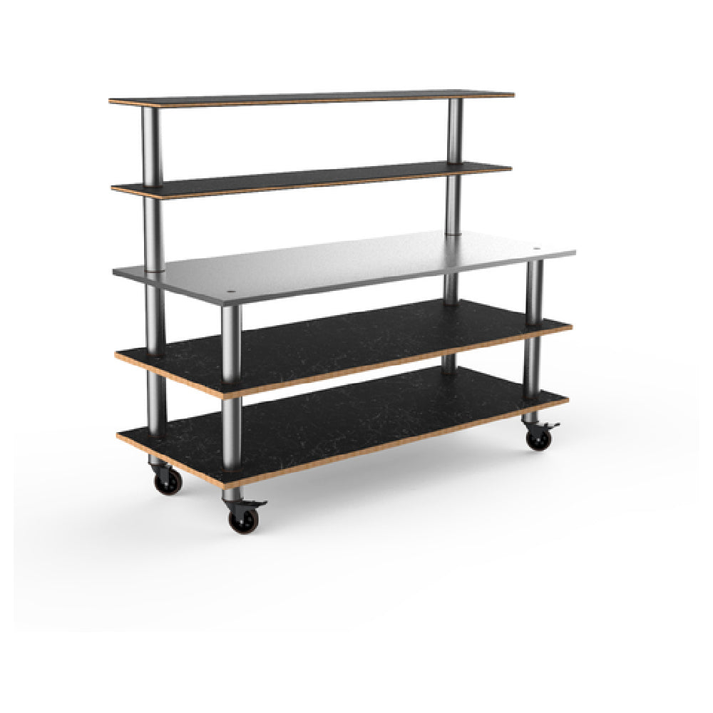 The Steelite MGCMLC02MSXW Mogogo Buffet Solutions Modular Back Bar Station 3-tier stands as a versatile and elegant addition to any hospitality setting, combining functionality with sophisticated design. Measuring 71 inches in length, 29-1/2 inches in width, and 60-1/2 inches in height, this rectangular back bar station is meticulously crafted with a stainless steel work surface, ensuring durability and ease of maintenance. It features two back shelves, providing ample space for storage and organization, enhancing operational efficiency in high-demand environments. The station's top is adorned with Nero Marquina marble BHP high-pressure laminate with a bamboo core, offering a sleek, modern aesthetic that complements various interior styles. Supported by brushed stainless steel legs mounted on casters, this modular unit ensures mobility and adaptability, making it an ideal choice for catering events or dynamic restaurant settings. The Steelite MGCMLC02MSXW is packed as a single unit, underscoring its substantiality and design integrity. This product is a strategic investment for establishments seeking to optimize space while delivering a high-end visual appeal, catering to markets ranging from upscale hotels to event management companies that require both form and function in their service environments.