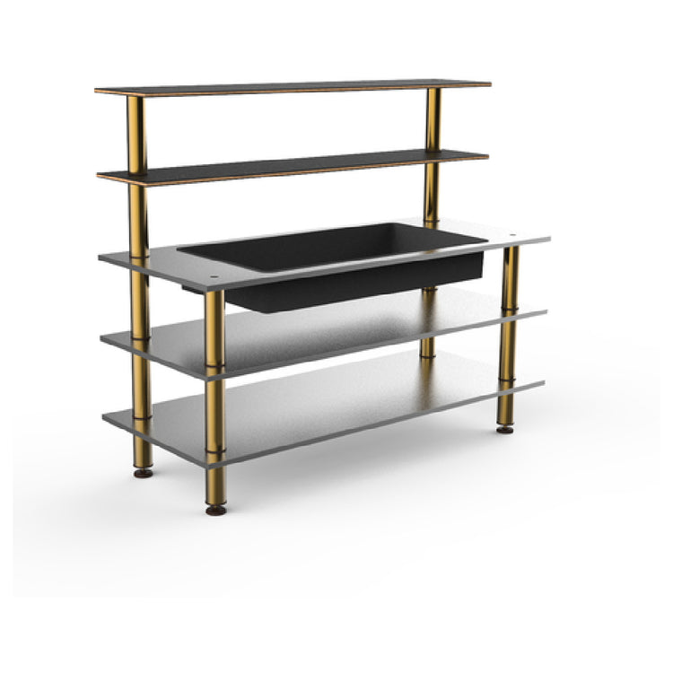 The Steelite MGCMLC03MBXF Mogogo Buffet Solutions Modular Pro Back Bar is an innovative 5-tier system designed for versatility and elegance in professional settings. Measuring 71 inches by 29-1/2 inches by 60-1/2 inches, this rectangular unit is expertly crafted to suit multiple environments, from upscale hotel buffets to dynamic event spaces. Its standout feature, an insulated ice well, enhances its utility by ensuring beverages remain chilled, a crucial benefit for the hospitality industry. The structure includes two back shelves, providing ample space for storage and display, thereby increasing its functional appeal. The Nero Marquina marble BHP high-pressure laminate with a bamboo core top not only offers durability but also a stylish aesthetic, appealing to establishments aiming to combine functionality with luxury. Supported by stainless steel and brushed brass legs, the robust construction ensures stability and longevity, making it a reliable choice for high-traffic areas. The unit is shipped knocked down, facilitating easier transportation and assembly, a practical feature for businesses with logistical concerns. With its blend of practicality and sophisticated design, the Steelite MGCMLC03MBXF is an asset tailored to enhance the operational efficiency and visual appeal of any professional food and beverage setting.