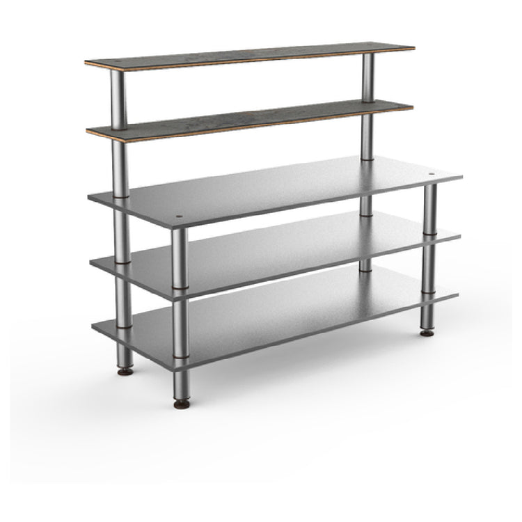 The Steelite MGCMLC04GSXF Mogogo Buffet Solutions Modular Pro Back Bar is a versatile and sophisticated addition to any hospitality setting. This modular back bar unit features a 5-tier design, providing ample space for various display and storage needs. Measuring 71 inches in length, 29-1/2 inches in width, and 60-1/2 inches in height, its substantial size is ideal for large-scale service environments. The back bar comes equipped with a solid stainless steel top, ensuring durability and easy maintenance, while the brushed stainless steel legs provide stable support. Enhanced by two back shelves, this unit offers additional display or storage capacity, optimizing functionality. The grey slate BHP high-pressure laminate with a bamboo core adds an elegant aesthetic, making it suitable for upscale venues. Designed to be knocked down, the Steelite MGCMLC04GSXF is easy to transport and assemble, allowing for flexibility in configuration and location. This modular back bar is constructed from high-quality materials, catering to the demanding needs of the food and beverage industry, from hotels and restaurants to catering services. Its robust structure and elegant design make it a practical and stylish solution for professionals seeking reliable and attractive buffet solutions.