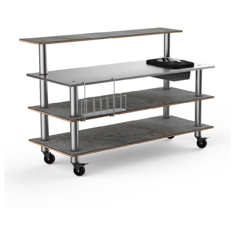 The Steelite MGCMLC05GSXW Mogogo Buffet Solutions Modular ProBar Station - 4-tier - 71" x 29-1/2" x 47-1/2"H is an innovative solution designed for the hospitality industry, particularly catering and event management sectors. This rectangular station features a solid stainless steel top, ensuring durability and a sleek appearance. It is equipped with a double wall ice bin, providing efficient insulation to keep ice intact for longer periods, essential for high-volume events. The inclusion of a slick speed rail allows for quick access to bottles, enhancing service efficiency. Additionally, the ProBar Station includes one back shelf, offering extra storage space for supplies or equipment. The top is constructed with grey slate BHP high-pressure laminate, which incorporates a bamboo core, combining aesthetic appeal with robust construction. The brushed stainless steel finish adds a touch of elegance while resisting corrosion. Measuring 71 inches in length, 29-1/2 inches in width, and 47-1/2 inches in height, the station is spacious enough to accommodate various setups, making it versatile for different event formats. This product is packed individually, ensuring careful handling and delivery. Its modular design enables adaptability across diverse service environments, highlighting its value in dynamic culinary settings.