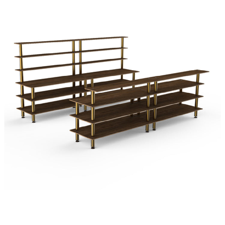 The Steelite MGCMLC11WBXF Mogogo Buffet Solutions Modular Double Bar is a sophisticated addition to any event or hospitality setting, featuring a comprehensive modular design. This product includes a meticulously crafted back bar measuring 142 inches in length, 29-1/2 inches in width, and 73 inches in height, alongside a front bar that stands at 142 inches long, 34-1/2 inches wide, and 47-1/2 inches high. Both components are constructed with Bengali mango wood BHP high-pressure laminate, complemented by a bamboo core top, providing both durability and elegance. The brushed brass legs add a touch of luxury and stability to the structure. Designed to be knocked down for efficient packing and transportation, this modular bar solution is ideal for venues requiring flexible and stylish bar configurations. Its robust construction and high-quality materials make it suitable for high-traffic environments such as hotels, banquet halls, and upscale catering events, offering an adaptable and aesthetically pleasing solution for beverage service. The Steelite MGCMLC11WBXF is not just a piece of furniture, but a statement of style and functionality, catering to the diverse needs of the hospitality industry with its unique blend of form and function.
