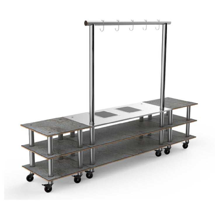 The Steelite MGCMLD02GSXW Mogogo Buffet Solutions Modular Nemco Induction Station 3-tier is an advanced culinary fixture tailored for modern buffet and catering environments. This induction station measures 130 inches in length, 29-1/2 inches in width, and stands 96 inches tall, providing a substantial and commanding presence. It features a drop-in, double well design, offering versatile cooking options for large-scale service needs. The three-tier structure accommodates a variety of configurations, enhancing the efficiency of food presentation and service. The unit is equipped with cooking touch control technology, allowing precise temperature management for a wide range of culinary applications. Constructed with grey slate BHP high-pressure laminate and a bamboo core top, it combines aesthetics with durability. The brushed stainless steel construction not only ensures longevity but also complements any sophisticated dining setting. Additionally, the induction station includes an arch and five hooks, adding functionality by providing convenient storage and organization for utensils and accessories. The Steelite MGCMLD02GSXW is designed to meet the needs of the hospitality industry, offering a blend of innovation, design, and practicality for venues ranging from high-end hotels to bustling banquet halls.