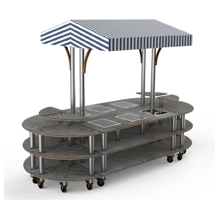 The Steelite MGCMLD03GSWW Mogogo Buffet Solutions Modular Warming Nemco Induction Market Station is a versatile and innovative solution for modern buffet settings. This 3-tier unit features a drop-in design with 6 well compartments, measuring 130" x 59" x 96"H. Its rounded shape and touch control system enhance user accessibility and ease of operation. The station is equipped with four triangular shelves, providing ample space for various food presentations. The surface is constructed with grey slate BHP high-pressure laminate, complemented by a bamboo core top, offering durability and a stylish aesthetic. The station is adorned with a white/blue canopy, adding a contemporary flair to the design. It is constructed with brushed stainless steel, ensuring longevity and resistance to wear. This modular warming station is ideal for catering services, hotels, and banquet halls, offering a sophisticated and efficient means of food display and service. Its unique design and quality materials make it a standout choice for businesses aiming to enhance their buffet presentation while maintaining high standards of functionality and style.