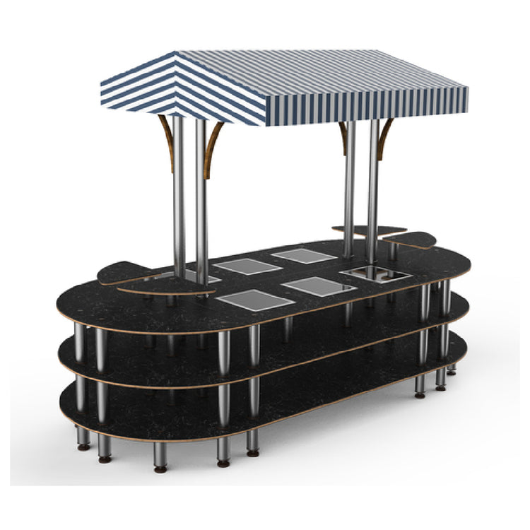 The Steelite MGCMLD03MSWF Mogogo Buffet Solutions Modular Warming Nemco Induction Market Station is a sophisticated 3-tier unit designed for the modern catering industry. This product features a drop-in design with six wells, providing ample space for diverse culinary presentations. Its dimensions are 130 inches by 59 inches by 96 inches in height, making it a substantial fixture for any high-capacity setting. The station is enhanced with rounded edges and user-friendly touch controls, ensuring both safety and ease of operation. The unique construction includes four triangular shelves, offering additional storage and display options. The top is crafted from Nero Marquina marble BHP high-pressure laminate with a bamboo core, combining elegance with durability. A white and blue canopy adds a touch of modern aesthetics while serving practical needs. This unit is meticulously packed, ensuring each component is delivered in pristine condition. The Steelite MGCMLD03MSWF is ideal for hotel buffets, event spaces, and upscale dining establishments, catering to a diverse range of market segments with its blend of functionality and style.
