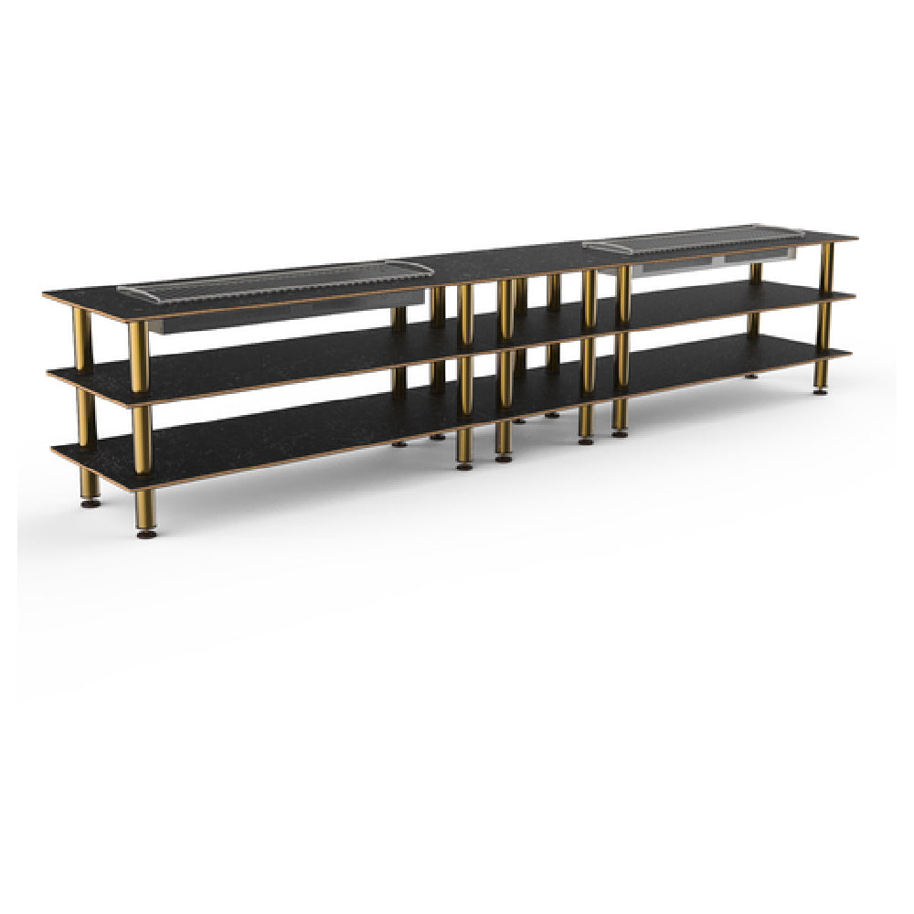 The Steelite MGCMLD04MBXF Mogogo Buffet Solutions Modular Double Heat Buffet Table is a sophisticated choice for catering and hospitality professionals, designed to elevate buffet presentations with precision and elegance. With a substantial size of 171-1/2 inches by 29-1/2 inches and a height of 36-1/2 inches, this three-tier, rectangular buffet table integrates drop-in, double well features for versatile service options. Utilizing canned heat, it ensures consistent temperature maintenance, essential for optimal food presentation. The table boasts a Nero Marquina BHP high-pressure laminate with a bamboo core top, offering a striking visual appeal combined with durability. Its construction is complemented by a sleek black canopy and brushed brass legs, contributing to its modern aesthetic. The knocked-down design facilitates convenient transportation and assembly, making it a practical solution for dynamic service environments. This modular double heat buffet table is suitable for various segment markets within the food service industry, providing a unique value proposition through its blend of functionality, style, and adaptability. Whether used in high-end hotels, banquet halls, or event venues, the Steelite MGCMLD04MBXF is engineered to enhance the dining experience, reflecting a commitment to quality and innovation in buffet solutions.