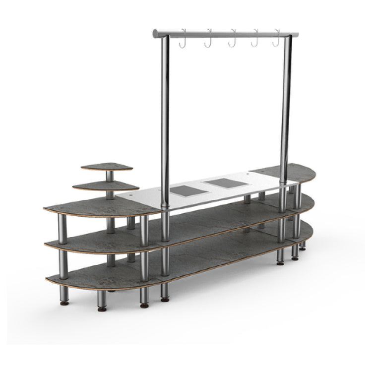 The Steelite MGCMLD05GSXF Mogogo Buffet Solutions Modular Streamline Arch Nemco Induction Station is a versatile culinary platform engineered to elevate buffet service efficiency and style. Measuring 130 inches by 29-1/2 inches by 96 inches high, this induction station is equipped with a three-tier design and a practical drop-in, double well configuration, making it a formidable choice for catering professionals seeking adaptable buffet setups. Its construction incorporates grey slate BHP high pressure laminate with a bamboo core top, providing a durable and visually appealing surface, complemented by brushed stainless steel legs for sturdy support. This station includes two shelves and five hooks, offering ample storage and display options for culinary creations. Engineered for power and reliability, it features an 1800-watt induction capacity operating at 120 volts, ensuring efficient heating and food service operations. The MGCMLD05GSXF is an ideal solution for high-volume food service environments, such as hotels or conference centers, where modular flexibility and premium design are paramount. Its thoughtful design and robust construction make it a valuable asset for enhancing buffet presentation and functionality. Packed by one each, this induction station is a distinctive element within the Mogogo Buffet Solutions range, catering to diverse market segments within the hospitality industry.