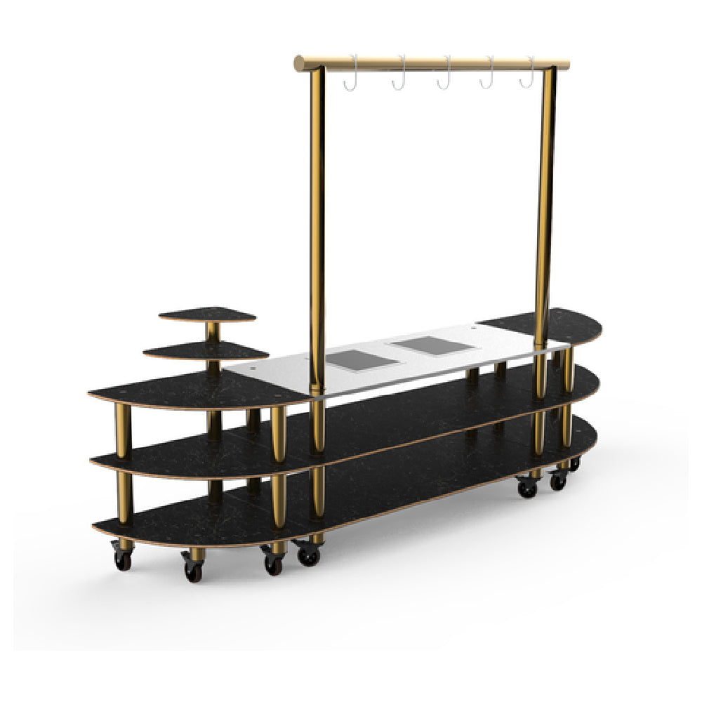 The Steelite MGCMLD05MBXW Mogogo Buffet Solutions Modular Streamline Arch Nemco Induction Station is an innovative and versatile fixture designed to enhance buffet presentations. Featuring a 3-tier configuration, this induction station includes a drop-in, double well design, measuring 130 inches in length, 29-1/2 inches in width, and 96 inches in height. It is equipped with two shelves and five hooks, providing ample space for organizing and displaying food items efficiently. The station's top is crafted from Nero Marquina marble BHP high pressure laminate with a bamboo core, offering a sophisticated and durable surface. Enhanced with brushed brass casters, this unit not only adds mobility but also a touch of elegance to any setting. Powered by 1800 watts, the Mogogo Buffet Solutions induction station is designed for high performance, ensuring consistent heat distribution. This product is ideal for catering services, high-end restaurants, and hotel buffets, offering a combination of style, functionality, and durability. The modular design allows for easy customization and adaptability to various event settings, making it a valuable investment for businesses across the hospitality industry looking to elevate their food presentation capabilities.