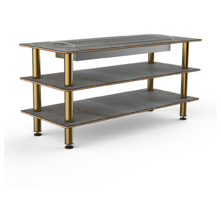 The Steelite MGCMLD06GBXF Mogogo Buffet Solutions Modular Heat Table is a versatile and sophisticated addition to any buffet or catering setup. This 3-tier rectangular table measures 71 inches in length, 29-1/2 inches in width, and stands at a height of 35 inches, making it an ideal size for a range of hospitality environments. Its top surface is crafted from grey slate BHP high pressure laminate, which is reinforced by a bamboo core, ensuring durability and a sleek aesthetic. The table is supported by brushed brass legs, offering both stability and a touch of elegance. Designed to be knocked down, it comes conveniently packed by 1 each, making it easy to transport and assemble. The unique modular design allows for flexibility in configuration, catering to the varied needs of hotels, restaurants, or event venues. This product is particularly valuable in environments where both functionality and style are paramount, allowing for an efficient and visually appealing presentation of food items. The Steelite MGCMLD06GBXF Mogogo Buffet Solutions Modular Heat Table exemplifies a blend of practicality and modern design, making it an essential component for enhancing culinary displays.