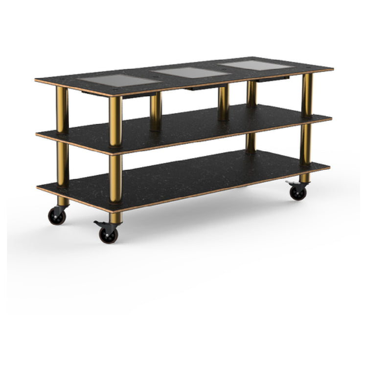 The Steelite MGCMLD07MBXW Mogogo Buffet Solutions Modular Nemco Induction Warming Unit is an advanced, versatile warming solution for modern catering needs. Measuring 71 inches by 29-1/2 inches by 35 inches in height, this rectangular, triple-well unit offers a spacious design to accommodate various buffet settings. It features intuitive touch controls for seamless operation, a touch that modernizes and elevates user experience. The unit's top is crafted from Nero Marquina marble BHP high-pressure laminate, which not only provides an elegant aesthetic but also boasts a bamboo core for enhanced durability and eco-friendliness. Mobility is simplified with its brushed brass casters, making it easy to reposition within any venue. Operating at 270 watts with a 120-volt, 2.2-amp power specification, this warming unit ensures efficient energy use while maintaining consistent warmth. Each unit is thoughtfully packaged by Steelite International, emphasizing quality and reliability. Designed specifically for catering professionals, event planners, and large-scale food service operations, the Steelite MGCMLD07MBXW is a high-performing solution that merges style with cutting-edge induction technology, meeting the diverse demands of maintaining food temperature in a variety of environments.