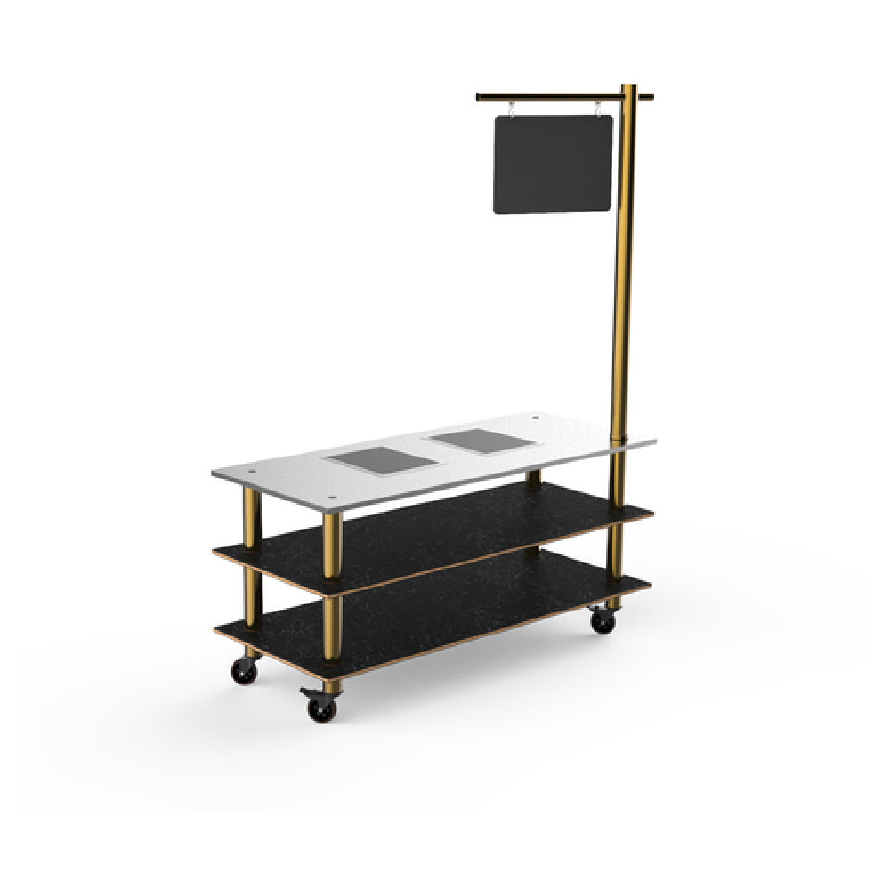 The Steelite MGCMLD12MBXW Mogogo Buffet Solutions Modular Nemco Pro Cooking Induction is a versatile and innovative 3-tier cooking solution designed for professional environments where efficiency and aesthetic appeal are paramount. Measuring 71 inches in length by 29-1/2 inches in width and standing 35 inches high, this unit provides ample space for culinary presentation and preparation. It features a double well configuration, enhancing its utility and functionality in buffet setups. Notably, the unit includes a sign post, which can be utilized for branding or informational purposes. The top surface is crafted from Nero Marquina marble BHP high-pressure laminate with a bamboo core, marrying durability with elegance. The inclusion of brushed brass casters ensures mobility, making it adaptable for dynamic settings. Operating at 1800 watts with a power specification of 120 volts and 15 amps, it delivers reliable cooking performance. This modular induction cooking unit is packed individually, ensuring safe and secure delivery. Its sophisticated combination of design and technical specifications makes it an ideal choice for catering services, high-end dining environments, and hospitality sectors that prioritize both functionality and style in their buffet solutions.