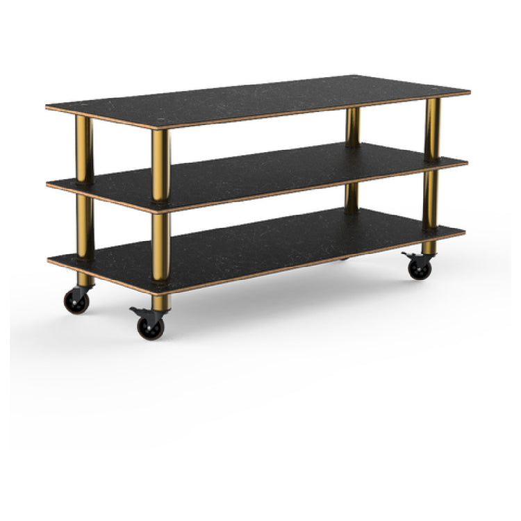 The Steelite MGCMLX01MBXW Mogogo Buffet Solutions Modular Classic Serving Station 3-tier is a versatile and sophisticated addition to any hospitality setting, designed to elevate buffet presentations. This large, rectangular serving station measures 71 inches in length, 29-1/2 inches in width, and stands 35 inches high, providing ample space for food displays across its three tiers. The top surface is crafted from Nero Marquina marble BHP high-pressure laminate with a robust bamboo core, combining elegance with durability. The station's mobility is enhanced by brushed brass casters, allowing for easy repositioning within your event space while maintaining a luxurious appearance. The knockdown feature ensures convenient disassembly and storage, making it an efficient solution for venues with dynamic layout needs. This product is packaged as a single unit, ensuring that all components arrive ready for assembly. The Steelite MGCMLX01MBXW is particularly well-suited for use in high-end hotels, catering events, and fine dining establishments, where its blend of style and practicality can be fully appreciated. Its design not only complements various interior aesthetics but also meets the functional demands of a bustling buffet environment, making it a standout choice for professionals seeking both form and function in their serving solutions.