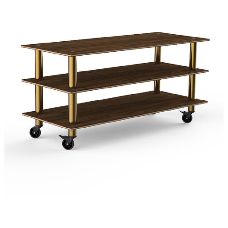 The Steelite MGCMLX01WBXW Mogogo Buffet Solutions Modular Classic Serving Station 3-tier is an innovative serving solution designed to cater to diverse market needs within the hospitality industry. This large, rectangular serving station measures 71 inches in length, 29-1/2 inches in width, and stands at a height of 35 inches, providing ample space for displaying a variety of culinary creations. It features a sophisticated design with a Bengali mango wood BHP high-pressure laminate top, which includes a bamboo core, offering durability and a touch of elegance. The serving station is equipped with brushed brass casters, allowing for easy movement and flexibility in setup, making it ideal for dynamic event environments. Its knockdown construction ensures convenient assembly and disassembly, facilitating transportation and storage. Whether for a hotel buffet, a catering event, or a banquet hall, the Steelite MGCMLX01WBXW combines aesthetic appeal with practical functionality. It is packed as a single unit, emphasizing its substantial presence and utility. This serving station represents a perfect blend of style and practicality, making it a valuable addition to any professional setting where quality presentation and versatility are paramount.