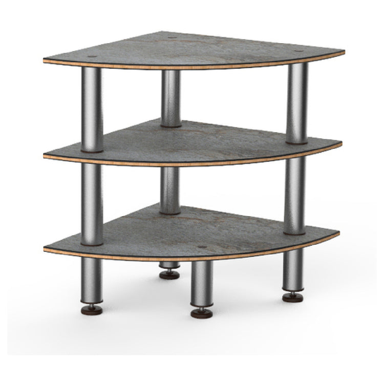The Steelite MGCMLX04GSXF Mogogo Buffet Solutions Modular Classic Corner Unit 3-tier is a sophisticated piece of buffet furniture designed for versatile dining environments. Measuring 29-1/2 inches by 29-1/2 inches with a height of 35 inches, this triangular unit is crafted to optimize space while offering an elegant presentation. The top surface is constructed from grey slate BHP high-pressure laminate with a bamboo core, providing both durability and an aesthetic appeal that complements a variety of settings. Supported by brushed stainless steel legs, this unit not only showcases a modern design but also ensures stability and longevity. The knockdown feature allows for easy assembly and disassembly, making it highly adaptable for event planners or catering services that require mobile and customizable setups. This modular corner unit is ideal for hospitality environments, restaurants, or corporate event spaces where style and functionality are paramount. Its unique combination of materials and thoughtful engineering underscores a commitment to quality and innovative design, offering a comprehensive solution for efficient and attractive buffet arrangements.