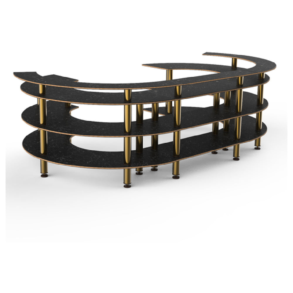The Steelite MGCMSA01MBXF Mogogo Buffet Solutions Modular Open C Serving Station 4-tier is a versatile serving solution designed to meet the varied needs of the hospitality industry. Measuring 134-1/2 inches in length, 84 inches in width, and standing at 41 inches high, this serving station offers ample space for an array of presentation possibilities. Its four-tier design provides multiple levels for displaying a diverse range of culinary offerings, enhancing the visual appeal of any buffet setup. The serving station features a Nero Marquina marble BHP high-pressure laminate surface with a bamboo core top, combining elegance and durability for high-traffic environments. The brushed brass legs not only add a touch of sophistication but also ensure stability. This modular unit is designed for easy assembly and disassembly, making it a practical choice for events that require swift setup and teardown. The knockdown feature allows for convenient transportation and storage, catering to the needs of caterers and event organizers. Packed individually, this serving station is an excellent investment for those seeking a reliable and stylish buffet solution that can adapt to various settings and occasions. The Steelite MGCMSA01MBXF is a testament to innovative design and exceptional craftsmanship in buffet presentation.
