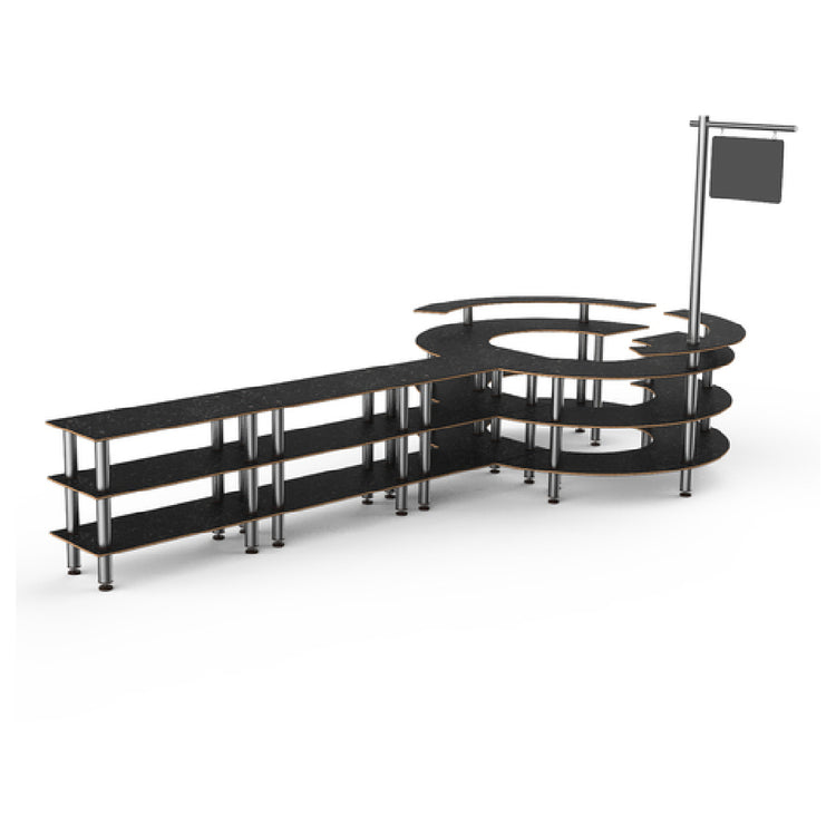 The Steelite MGCMSA02MSXF Mogogo Buffet Solutions Modular Creative DIY Station - 4-tier is a versatile and sophisticated addition to any catering environment, perfect for those looking to enhance their culinary presentation with a touch of elegance. Measuring 205 inches in length, 98 inches in width, and standing 101 inches tall, this station provides ample space for a variety of buffet setups. It features a Nero Marquina marble BHP high-pressure laminate with a bamboo core top, combining durability with an exquisite aesthetic that is sure to impress guests across different segments of the hospitality industry. The brushed stainless steel legs not only offer a sleek and modern appearance but also ensure stability and support for the entire structure. Designed for convenience, the unit is knockdown, meaning it can be easily dismantled and reassembled, making it ideal for event planners, hotels, and resorts that require flexibility and efficiency in their buffet presentations. Each unit is carefully packed, maintaining its pristine condition upon delivery. This modular station is an excellent choice for establishments aiming to offer an enhanced dining experience, capturing both attention and admiration through its unique design and functional versatility.