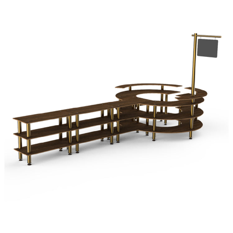 The Steelite MGCMSA02WBXF Mogogo Buffet Solutions Modular Creative DIY Station 4-tier is an innovative and versatile buffet solution tailored for dynamic food service environments. With dimensions of 205" x 98" x 101"H, this 4-tier station offers ample space for a variety of display configurations, making it a standout choice for caterers, hotels, and event planners. The station features a high-pressure laminate top made of Bengali mango wood, underpinned by a bamboo core, providing both aesthetic appeal and durability. Supported by elegant brushed brass legs, the unit combines robustness with a touch of sophistication. Designed for ease of assembly, it arrives in a knockdown form, simplifying transportation and setup. The Steelite MGCMSA02WBXF Mogogo Buffet Solutions Modular Creative DIY Station is not just a piece of furniture, but a strategic asset that enhances the presentation and functionality of any buffet setting. Its modular design allows for creative customization, catering to diverse market segments such as upscale dining establishments, corporate events, and wedding venues. This station epitomizes the blend of form and function, offering a reliable platform to elevate any culinary presentation.