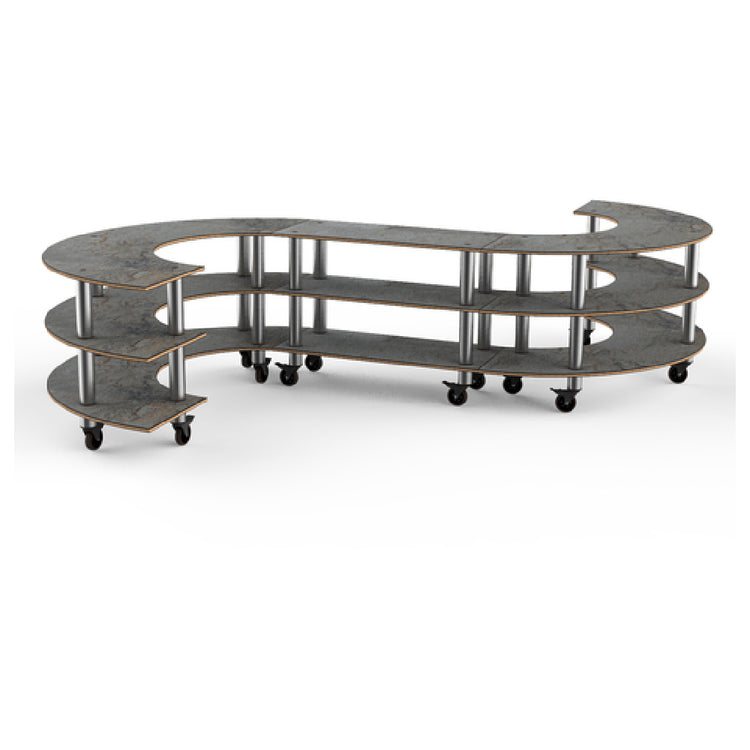 The Steelite MGCMSB02GSXW Mogogo Buffet Solutions Modular Serving Station is a sophisticated serving solution featuring a distinctive 3-tier design. Measuring 141-1/2 inches by 124 inches by 35 inches in height, this s-shaped station provides ample space for an elegant presentation in any hospitality setting. The top surface is crafted from grey slate BHP high-pressure laminate with a bamboo core, combining aesthetic appeal with durability. The inclusion of brushed stainless steel casters ensures smooth mobility, making it a versatile choice for dynamic environments. Designed for easy assembly, this knockdown unit is packaged individually, accommodating various logistical needs. The modular nature of the Steelite MGCMSB02GSXW makes it an ideal choice for catering professionals seeking customizable and efficient serving solutions. Its thoughtful construction caters to a range of market segments within the food service industry, from high-end hotels to corporate event planners, looking for robust and stylish buffet setups that can be tailored to specific event requirements.