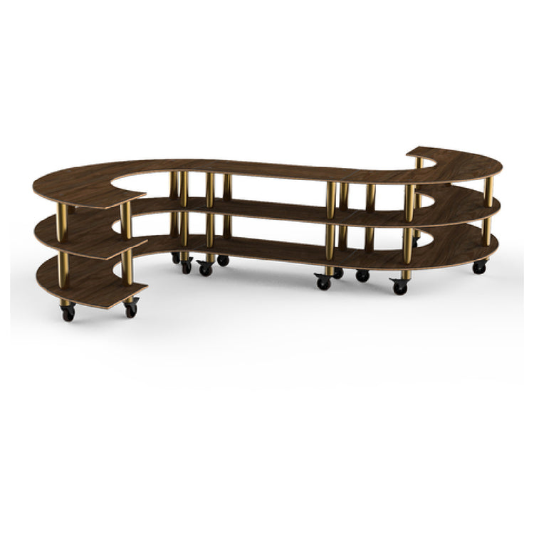 The Steelite MGCMSB02WBXW Mogogo Buffet Solutions Modular Serving Station is a versatile and elegantly designed piece perfect for the hospitality industry. This 3-tier serving station measures 141-1/2 inches by 124 inches by 35 inches high, providing ample space for displaying a variety of food items in a visually appealing manner. The station is s-shaped, adding a unique aesthetic touch that enhances any buffet setup. Constructed from high-quality Bengali mango wood, it features a BHP high-pressure laminate with a bamboo core top, ensuring durability and a premium finish. The brushed brass casters allow for easy mobility, making it simple to reposition the station as required, which is especially beneficial in dynamic environments like hotels, event venues, and catering operations. The knockdown design facilitates straightforward assembly and disassembly, saving time and effort during setup and teardown. Packed individually, this serving station is a smart choice for event coordinators and food service professionals seeking a reliable and stylish solution for their buffet needs. Its modularity allows for customization according to specific event themes or spatial requirements, making it a valuable addition to any professional catering setup.