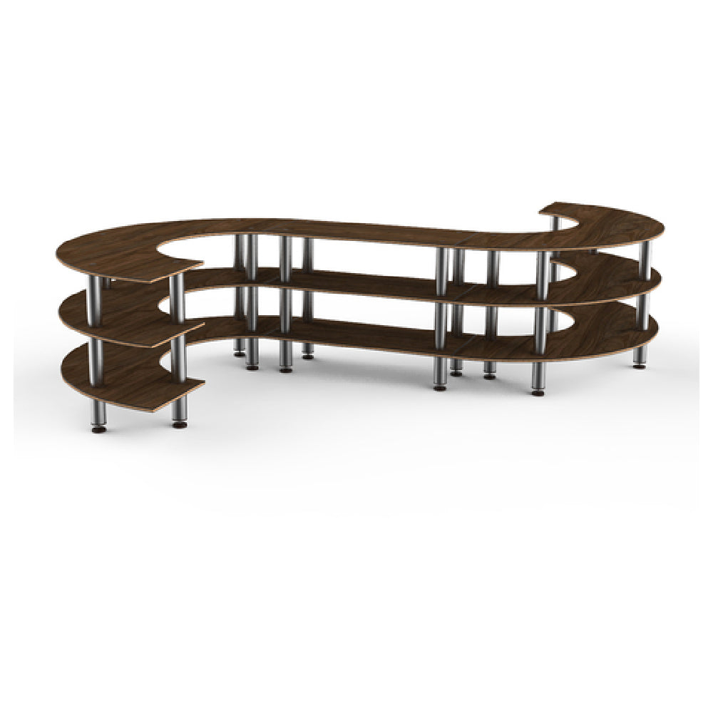 The Steelite MGCMSB02WSXF Mogogo Buffet Solutions Modular Serving Station is a sophisticated, three-tier system designed to elevate buffet presentations across various hospitality sectors. Its impressive dimensions of 141-1/2" x 124" x 35"H make it an ideal centerpiece for large-scale events and venues. The serving station features an elegant s-shaped design, adding a modern aesthetic to any dining setting. Crafted with Bengali mango wood BHP high-pressure laminate, this serving station boasts a bamboo core top, providing both durability and an attractive finish. The brushed stainless steel legs not only enhance stability but also complement the overall sleek look of the unit. This modular serving station is designed to be knockdown, facilitating easy assembly and disassembly for convenient storage and transportation. Packed by each unit, the Steelite MGCMSB02WSXF is engineered to meet the diverse needs of high-end hotels, banquet halls, and upscale catering services, providing a versatile and functional platform for food presentation that combines style with practicality.
