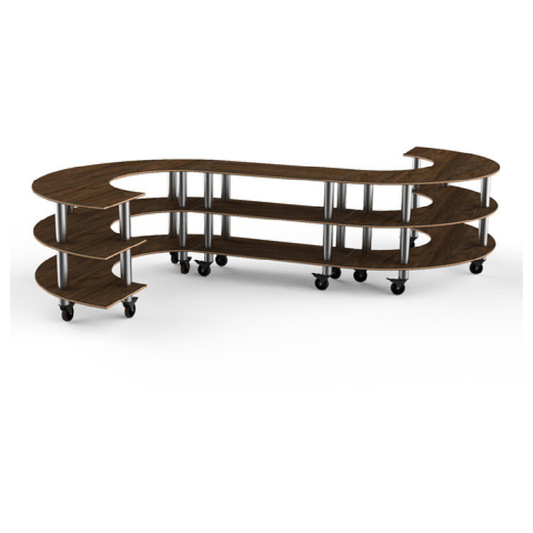 The Steelite MGCMSB02WSXW Mogogo Buffet Solutions Modular Serving Station is an innovative and versatile addition to any catering or hospitality environment. This s-shaped serving station spans an impressive 141-1/2 inches in length and 124 inches in width, with a height of 35 inches, making it a substantial piece for large-scale events or buffet setups. Featuring a 3-tier design, it allows for efficient and organized food presentation. The top is crafted from Bengali mango wood BHP high-pressure laminate with a bamboo core, offering both aesthetic appeal and durability. The structure is supported by brushed stainless steel casters, providing mobility and ease of setup, while its knockdown capability ensures convenient storage and transportation. Each unit is packed individually, emphasizing its quality and attention to detail. This modular serving station is particularly suitable for hotels, banquets, and catering services looking to enhance their service offerings with a blend of style and functionality. Its robust construction and thoughtful design cater to the diverse needs of different market segments within the industry, from upscale events requiring elegant presentation to high-volume venues needing reliable and efficient service solutions.