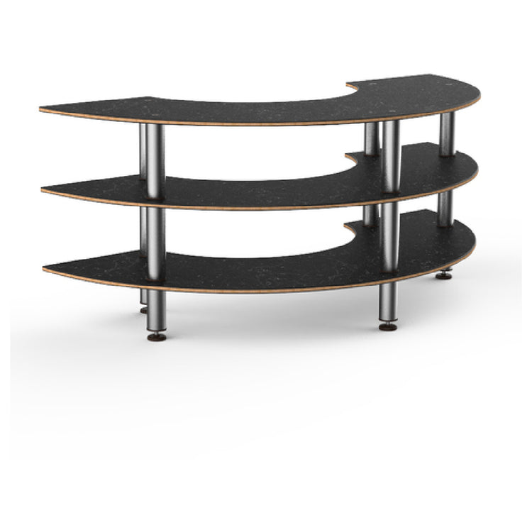 The Steelite MGCMSX01MSXF Mogogo Buffet Solutions Modular Creative Serving Station is a sophisticated and versatile three-tier serving station, meticulously designed to meet the dynamic needs of the hospitality industry. With dimensions of 81-1/2 inches by 41 inches by 35 inches in height, this station offers ample serving space while maintaining an elegant and modern aesthetic. The curved design, along with the luxurious Nero Marquina marble BHP high-pressure laminate, provides both style and durability. The laminate's bamboo core enhances structural integrity, ensuring a long-lasting performance. Supported by brushed stainless steel legs, this serving station not only promises robust stability but also complements contemporary decor styles. Its knockdown feature allows for efficient storage and transportation, catering to the flexibility required in event settings. Ideal for large-scale catering events, hotel buffets, and upscale dining establishments, the Steelite MGCMSX01MSXF combines functionality with premium materials, making it a distinguished choice for professionals seeking a high-quality, adaptable serving solution.
