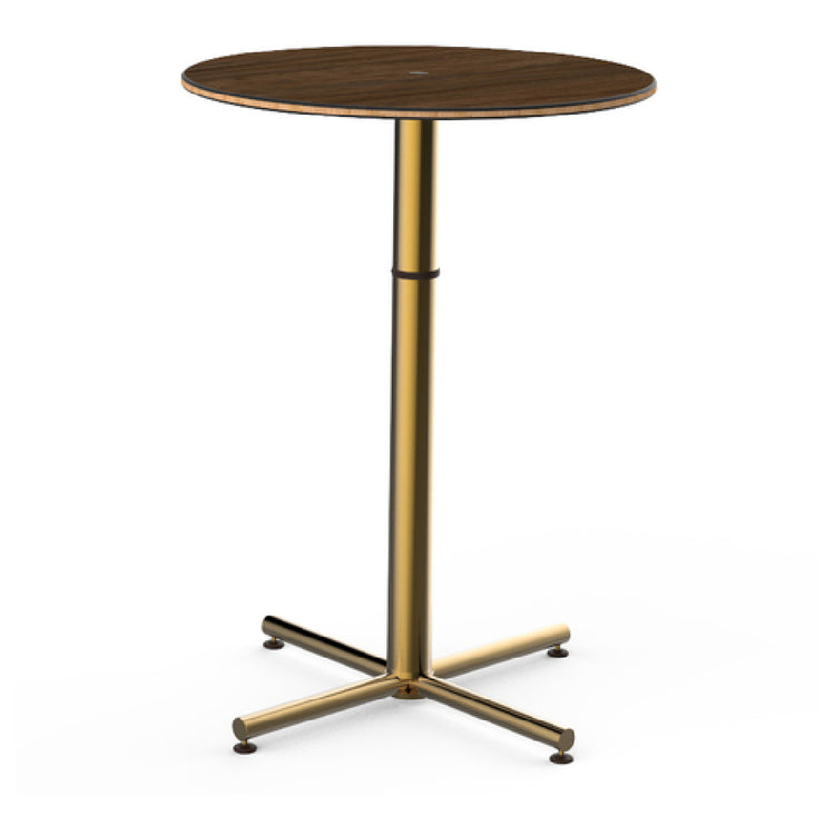 The Steelite MGCPBR01WBXX Mogogo Buffet Solutions Polo Bar Table 30" Dia. x 42"H Round is a versatile and elegantly designed furnishing solution, perfect for diverse commercial settings. Featuring a 30-inch diameter and standing at 42 inches high, this round table is an ideal choice for use in buffet setups, bars, or casual dining areas where space efficiency is crucial. The tabletop is crafted with a high-pressure laminate surface, supported by a bamboo core, ensuring a robust and durable finish that can withstand frequent use in high-traffic environments. Its brushed brass segments add a touch of sophistication, making it suitable for upscale venues that prioritize aesthetic appeal alongside functionality. The table incorporates a shelf, enhancing its utility by offering additional space for storage or display. Designed as a knockdown unit, it allows for convenient assembly and disassembly, aiding in transportation and storage efficiency. Packed individually, the Steelite Mogogo Polo Bar Table caters to market segments that value durability, aesthetic elegance, and practical design in their furniture investments. This table is an exemplary choice for operators seeking a high-quality product that balances style with functionality in hospitality and event settings.