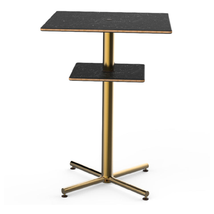 The Steelite MGCPBS02MBXX Mogogo Buffet Solutions Polo Bar Table is a versatile and elegant piece suitable for various hospitality settings. Measuring 30 inches by 30 inches with a height of 42-1/2 inches, this square table provides ample surface area for both functional and decorative purposes. It features a shelf that adds additional storage or display space, enhancing its utility. The top is constructed from Nero Marquina marble BHP high-pressure laminate, known for its durability and resistance to wear, and is supported by a robust bamboo core. This combination not only brings an aesthetic appeal with its striking visual contrast but also ensures longevity and sustainability. The table is accentuated with brushed brass segments, adding a touch of sophistication and modern appeal to its design. The knockdown feature implies that the table can be easily assembled and disassembled, making it a practical choice for events and venues where flexibility and space management are key. This product is packed individually, ensuring that each unit receives attention to detail and quality in packaging. These features make the Steelite Mogogo Polo Bar Table an attractive option for upscale restaurants, hotels, and event venues looking to combine style with functionality.