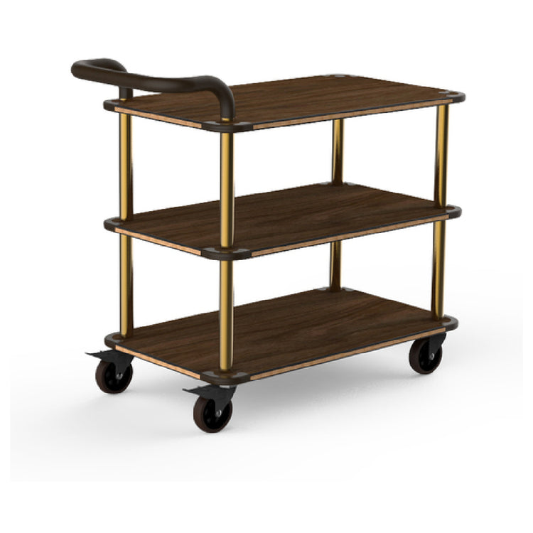 The Steelite MGCRNX01WBXX Mogogo Buffet Solutions Roll'n Service Cart is a versatile and multi-purpose piece of equipment designed to meet the diverse needs of food service operations. This service cart features dimensions of 41-1/2" x 21" x 36"H, making it a compact yet highly functional choice for various settings. It is equipped with three Bengali mango wood BHP shelves, offering both durability and aesthetic appeal. The cart includes a push handle for easy maneuverability, supported by heavy-duty casters that ensure smooth transport across different surfaces. Constructed with a stainless steel frame, this cart boasts a brushed brass finish, adding a touch of elegance to its robust design. It is a knockdown unit, meaning it is packed as a single item for convenient storage and assembly. The Steelite MGCRNX01WBXX Mogogo Buffet Solutions Roll'n Service Cart is ideal for catering events, hotel buffets, or restaurant service, providing reliable support for food and beverage presentation and service in a professional setting.