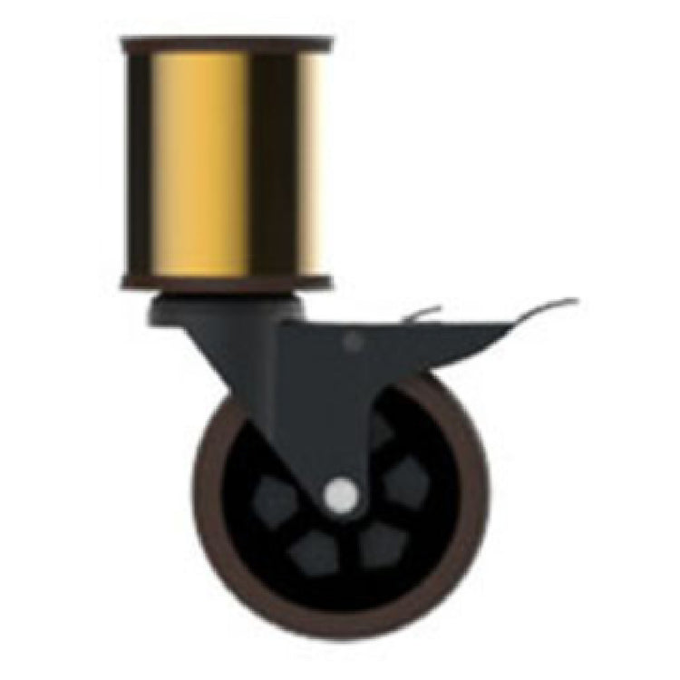 The Steelite MGSADDBR0604 Mogogo Buffet Solutions Modular Caster Swivel-stem With Brake is a highly specialized component designed for versatile buffet setups, catering to various market segments within the hospitality industry. This modular caster boasts a robust load capacity of 220 lbs, making it ideal for heavy-duty applications. Its swivel-stem design enhances maneuverability, allowing for smooth directional changes, while the integrated brake provides reliable stability, ensuring safety and precision during use. The inclusion of an adaptor broadens its adaptability across different setups. Crafted with TPR (thermoplastic rubber), the caster ensures quiet operation and floor protection, an essential feature for maintaining the integrity of flooring in high-traffic environments. The brushed brass segments add an element of sophistication and durability, making it not only functional but also aesthetically pleasing. Packed individually, this caster is a top choice for professionals seeking reliable components that uphold the Mogogo Buffet Solutions reputation for quality and innovation. This product serves as a crucial element in the modular buffet experience, enhancing both the operational efficiency and visual appeal of the setup, thus meeting the diverse needs of the food service industry.