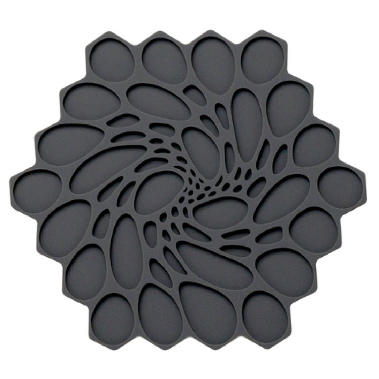 The Steelite MTTVHI00307 Trivet 7" Hive Shape is a versatile and essential accessory for any modern kitchen or bar setting. This trivet is thoughtfully designed in a hive shape, providing both aesthetic appeal and functional efficiency. Measuring 7 inches, it is crafted from high-quality silicone material, ensuring durability and resistance to high temperatures. The graphite color of the trivet adds a sleek and contemporary look, aligning perfectly with the Modern™ Mixologist collection's sophisticated style. Designed for bartools, this stock item comes efficiently packed, with six units per case, marked clearly as "Packed By: Cs." This makes it an ideal choice for professional bartenders and mixologists who value quality and style in their tools. The Steelite MTTVHI00307 Trivet provides excellent heat protection, ensuring surfaces are shielded from hot pots and pans, making it a practical addition to both home and professional settings. Its unique design and robust construction cater to diverse market segments, from culinary professionals to home enthusiasts, who appreciate the blend of form and function. This trivet serves as a reliable and stylish solution for anyone looking to enhance their kitchen or barware collection with a touch of modern elegance.