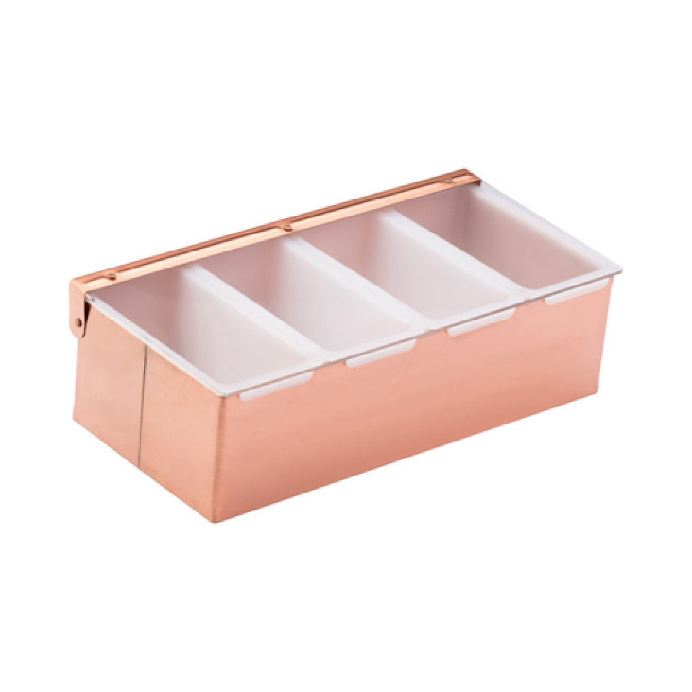 The Steelite UF91161 Condiment Holder with 4 Inserts is a precisely designed piece measuring 11.875 inches by 3.875 inches in height, crafted to meet diverse industry needs. This rectangle-shaped condiment holder is made from high-quality stainless steel, featuring a copper finish that adds a touch of elegance and durability, making it ideal for both high-end restaurants and casual dining establishments. As part of the Utopia collection and categorized under bar accessories, it serves a dual purpose by offering practical utility and enhancing aesthetic appeal. With four separate inserts, this condiment holder allows for organized storage and easy access to condiments, making it a versatile choice for busy bar settings, buffet lines, or kitchen prep areas. Its configuration supports efficient space management, ensuring that essential condiments are always within reach for quick service. The Steelite UF91161 is a stock item, simplifying the procurement process for businesses seeking reliable and stylish condiment solutions. Its robust construction promises long-term usage, even in high-traffic environments. This product is packed individually, ensuring it arrives in pristine condition, ready to integrate seamlessly into any professional setting. Whether for culinary or beverage purposes, the Steelite UF91161 stands as a testament to functional design and quality craftsmanship.