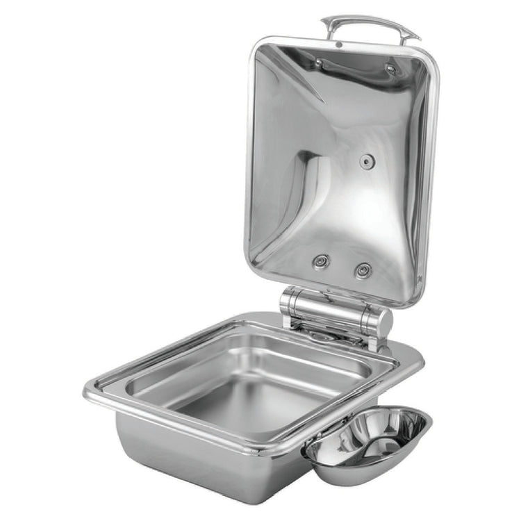 The Steelite WLWI35UMT Chafer Dish Body 4 Qt. Rectangular With Solid Hinged Lid is a high-quality catering essential that offers versatility and functionality for a variety of food service environments. With a 4-quart capacity, this rectangular chafer dish is designed to efficiently hold and present meals. The solid hinged lid facilitates easy access while maintaining heat and moisture within the dish, ensuring food stays warm and appetizing. Constructed from 18/10 stainless steel, it provides durability and a sleek, professional appearance, making it a reliable choice for both casual and formal dining settings. This chafer dish includes a food pan and spoon holder, providing added convenience for serving and maintaining cleanliness. Its induction-capable feature allows for energy-efficient and precise heating, catering to modern kitchens that prioritize sustainability and performance. Manufactured by Walco, the Idol series chafer dish is a stock item, ensuring availability for quick and easy procurement. The Steelite WLWI35UMT accommodates the needs of various market segments within the catering and hospitality industry, from high-end hotels to catering companies, due to its combination of durability, functionality, and elegant design.