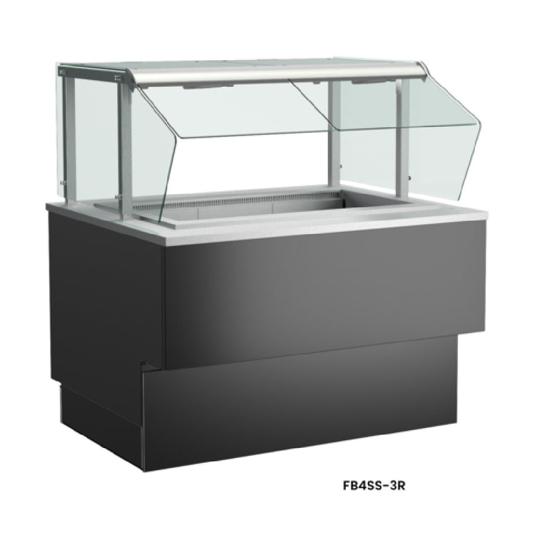The Structural Concepts FB4SS-3R Grocerant Inline Self-Service Refrigerated Display Case is a robust solution for displaying refrigerated products in a variety of commercial settings. With dimensions of 53"W x 43"D x 55-1/2"H, this unit is designed for remote refrigeration and offers a single-deck configuration that can accommodate three full-size pans, though pans are not included. The display case is equipped with a clear glass sneeze guard to protect merchandise while allowing customers a clear view of the products inside. An LED top light enhances product visibility, making it an appealing choice for high-traffic retail environments. The Blue Fin coated coil ensures energy efficiency and durability, while the white Sanalite® rear wrapping board adds functionality and convenience. Featuring a stainless steel interior and a laminated exterior, the FB4SS-3R is both stylish and robust. ETL-Sanitation certification underscores its compliance with sanitation standards, making it a reliable choice for grocery stores, convenience stores, and other foodservice businesses looking to present their refrigerated items attractively while maintaining stringent hygiene standards. This display case combines practical design with high-quality materials, catering to a diverse range of market segments within the food service industry.