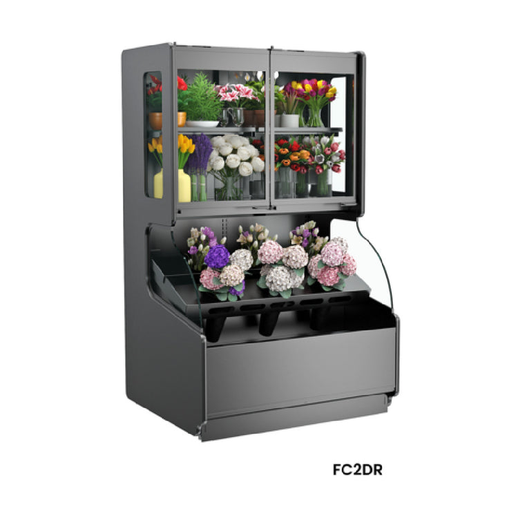 Structural Concepts, FC2DR, Allure Self-Service Refrigerated Combination Merchandiser, 50-3/4"W x 43-1/8"D x 87-7/8"H, remote DX refrigeration, clear glass front swinging doors, clear glass non-lighted adjustable shelving in upper display, full end panels, levelers, lower display holds (6) 13''H x 8''Dia buckets, black interior and exterior