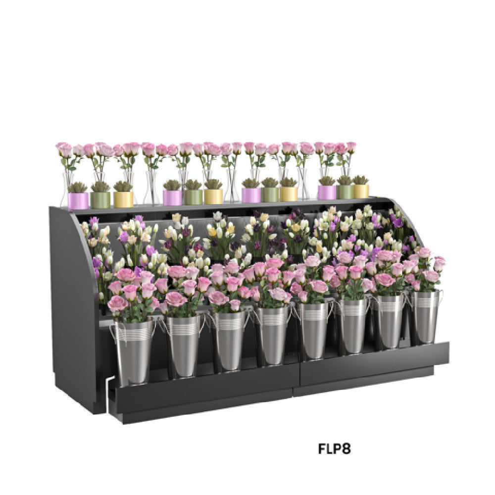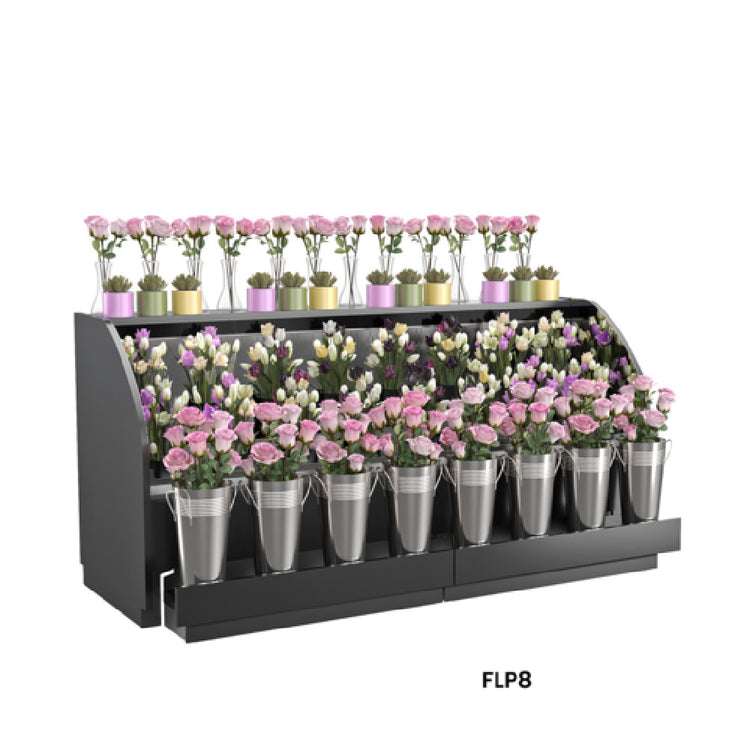 Structural Concepts, FLP8, Allure Self-Service Refrigerated Low Profile Merchandiser, 98-1/4"W x 34-1/8"D x 47-5/8"H, remote DX refrigeration, full end panels with stainless steel mirror interior, casters with levelers, adjustable lower front display with (3) levels, holds (24) 13''H x 8''Dia buckets, black interior and exterior