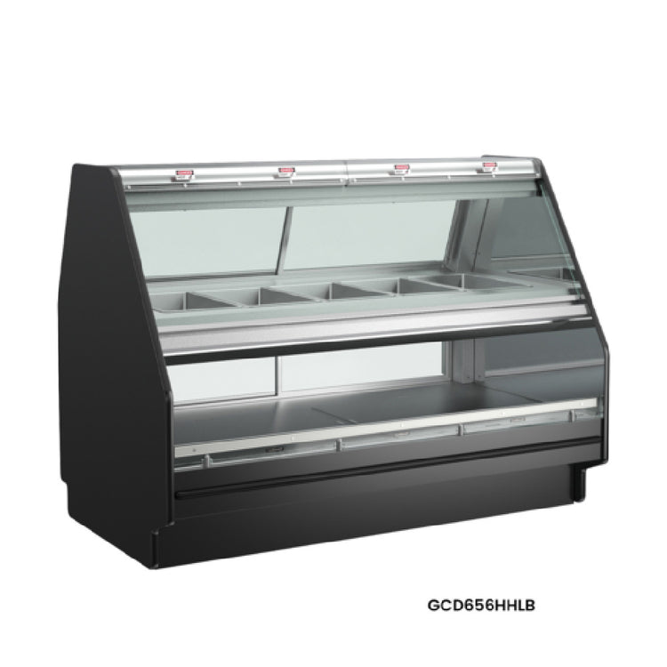 The Structural Concepts GCD656HHLB Fusion® Hot Over Hot Combination Case is a sophisticated display unit designed for versatile food service environments, measuring 73-1/8"W x 49-1/2"D x 55-3/4"H. This unit features a flat angled lift-up front glass, providing easy access and visibility, while the clear glass rear sliding doors enhance both display and operational efficiency. It boasts a heated deck for the lower display, ensuring consistent temperature control and optimal presentation for hot foods. The upper display is designed to accommodate full size pans up to 4"D, catering to different service needs. Additionally, the inclusion of condiment pan support rails offers added utility and convenience. Constructed with a stainless steel interior and rear exterior, the GCD656HHLB ensures durability and a sleek, professional appearance. It is certified by cETLus and ETL-Sanitation, attesting to its compliance with high industry standards for safety and hygiene. This combination case is particularly valuable for food service establishments looking to enhance their display capabilities while maintaining a focus on quality and reliability. The unit's technical features make it an ideal choice for diverse market segments, including restaurants, catering services, and commercial food operations seeking efficient, high-capacity solutions.