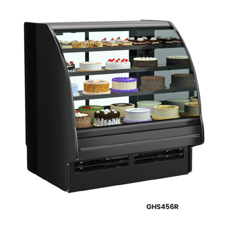 Structural Concepts, GHS656R (CURVED), Fusion® Refrigerated Full Service Case with Lift-up Curved Front Glass, 75-3/8"W x 43"D x 55-3/4"H, 40°F or less integrated average product temperature, LED top and shelf lights with frosted lens, Sliding rear doors, Breeze self-contained R290 refrigeration, stainless steel rear exterior, cETLus, ETL-Sanitation