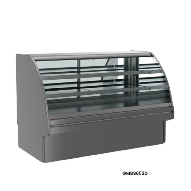 The Structural Concepts GMBS452D Fusion® Dry Service Case is a meticulously designed fixture measuring 48-3/4'W x 42-3/4'D x 51-5/8'H, tailored for ambient display purposes. It features a sleek curved lift-up front glass, enhancing visibility while adding a modern aesthetic touch. Illuminated by LED top and shelf lights with a frosted lens, this dry service case ensures products are consistently well-lit, creating an enticing display. The clear glass rear sliding doors provide easy access for staff, streamlining the service process. The stainless steel rear exterior not only offers a durable and easy-to-clean surface but also adds a touch of professional elegance. This model is non-refrigerated, making it ideal for displaying items that do not require temperature control, thus appealing to a wide range of market segments such as bakeries, patisseries, and cafes. The GMBS452D is certified cETLus and ETL-Sanitation, underscoring its adherence to stringent safety and sanitation standards. This dry service case is an exemplary choice for businesses seeking a reliable, visually appealing, and functional display solution that complements any professional setting while ensuring product integrity and customer satisfaction.